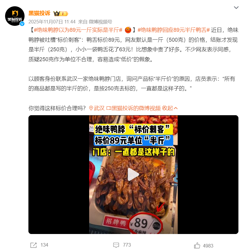 2025年11月,话题“绝味鸭脖 标价刺客”的话题引发关注。据悉,其鸭舌标价89元,网友默认是一斤(500克)的价格,结账才发现是半斤(250克),小小一袋鸭舌花了63元!比想象中贵了好多。不少网友表示同感,质疑250克作为单位不合理,容易造成“低价”的假象。不过,也有网友认为,绝味食品不是没有写价格,自己看不清,怪人家刺客?