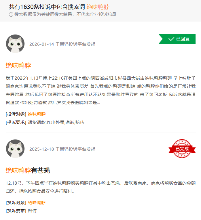 黑猫投诉平台上,截至1月26日,共有1630条投诉中包含“绝味鸭脖”,投诉内容涉及吃出苍蝇但商家拒绝按照食品安全进行赔付、鸭食管中吃出鸭毛、鱼豆腐中吃出牙签、卤牛肉变质等。