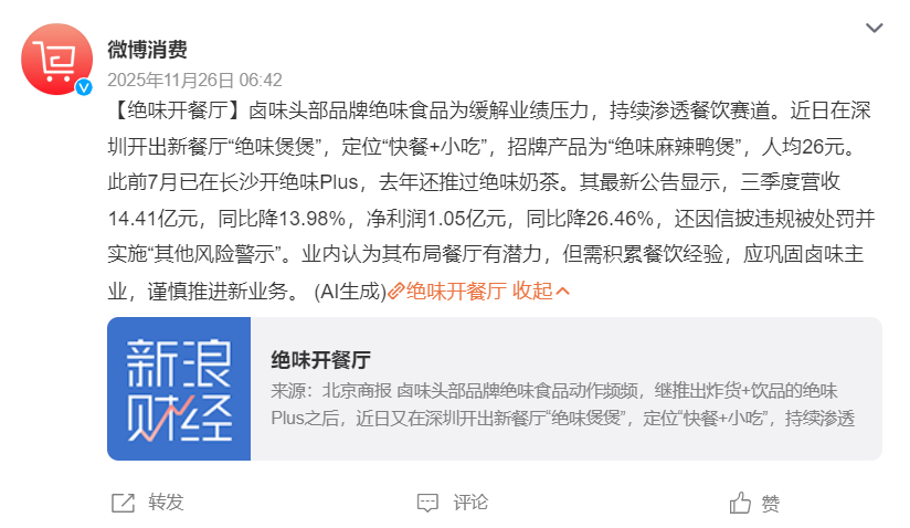 绝味食品的转型之路本质上是试图将消费者心中的“零食品牌”认知,重塑为“餐饮品牌”。然而,这条路上布满了挑战:它需要与传统的快餐品类竞争效率和性价比,需要强大的供应链支撑热食产品,更需要重新赢得投资者与消费者的双重信任。