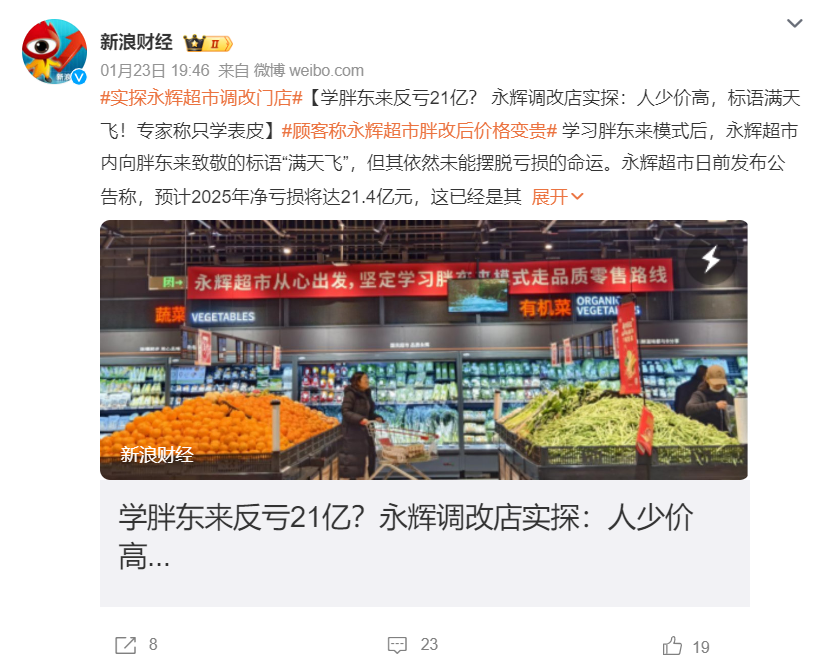 据“新浪财经”报道,某地区一家永辉超市调改店于2025年11月调改完成,永辉超市官方介绍称,调改后在卖场布局、商品结构、价格品质、顾客服务、员工福利、员工成长等方面均进行提升。