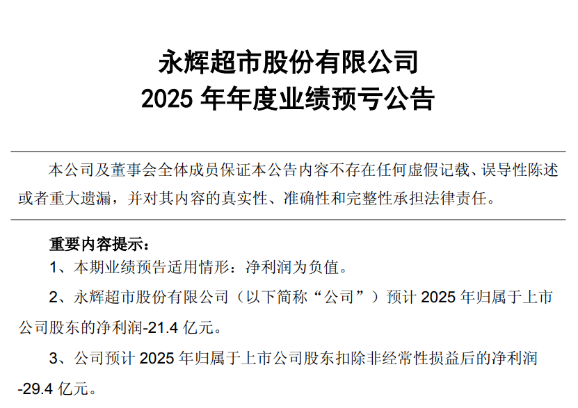 近日,永辉超市发布2025年度业绩预亏公告:2025年归母净利润预计亏损21.4亿元,同比扩大45.6%;扣非归母净利润预计亏损29.4亿元,较上年同期的24.1亿元亏损进一步扩大。这是这家老牌零售巨头自2021年以来的连续第5年亏损,5年累计亏损已突破百亿元。
