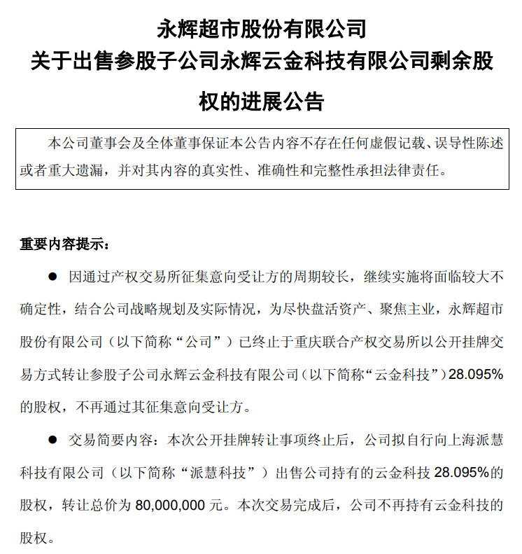 此外,1月22日,永辉超市公告,因通过产权交易所征集意向受让方的周期较长,继续实施将面临较大不确定性,结合公司战略规划及实际情况,为尽快盘活资产、聚焦主业,公司已终止于重庆联合产权交易所以公开挂牌交易方式转让参股子公司永辉云金科技有限公司(简称“云金科技”)28.095%的股权,不再通过其征集意向受让方。