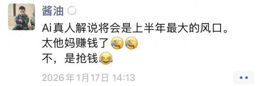 “AI真人解说将会是上半年最大的风口,太赚钱了,不,是抢钱”。