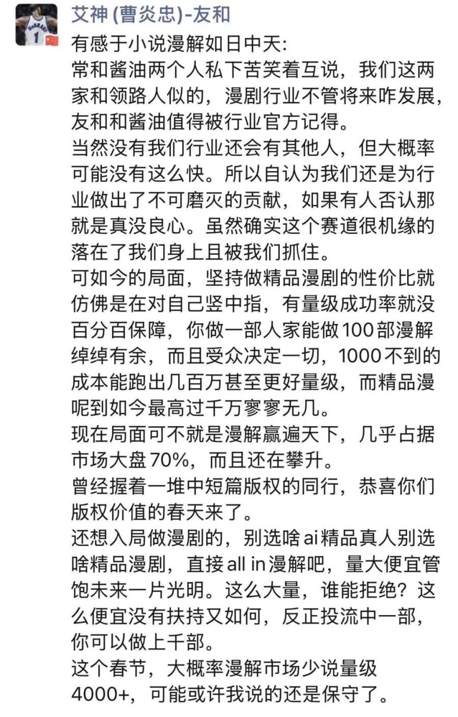 日前,头部漫剧承制方酱油文化负责人酱油在朋友圈发出感叹。