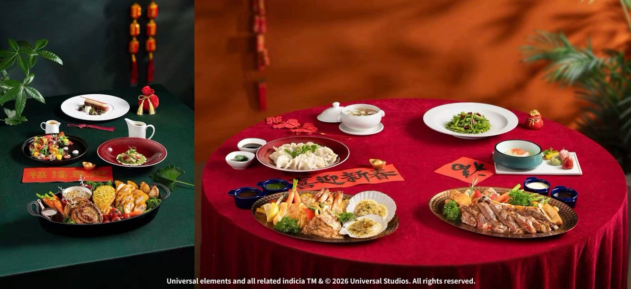 环球新春广场上,爆肚粉、肉丝煎饼、绿豆糕、糖人、糖葫芦等年味小吃满载新年滋味,让“小时候的味道、北京的味道、年的味道” 唤起游客的味蕾记忆。年轻人在这里驻足充能、拍照打卡,家庭游客带孩子体验传统文化元素,冬日里呈现一片红火盎然的新春消费图景。主题公园内的餐厅推出多款兼具文化融合、视觉创意与味觉层次的新春菜肴,餐厅内人声与笑语交织。落霞餐厅年夜饭中西合璧,满足一家人的所有胃口;哈蒙德餐厅精致的年夜大餐,不管哪个角度都能美美出片。北京环球影城大酒店、诺金度假酒店、城市大道多家餐厅同步上新节庆美食,年“味”配方融合中西特色,让团圆喜悦与味蕾惊喜共同绽放。