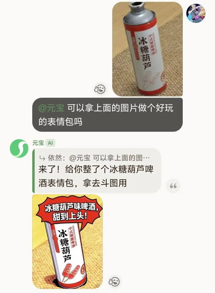 在创建的群聊中,用户主要能用得到AI的交互方式就是@元宝,提出各种要求。比如,让AI给你总结上面群友们的聊天内容、帮你当群聊里的搜索助手,回答各类问题,把图片做成表情包等等。