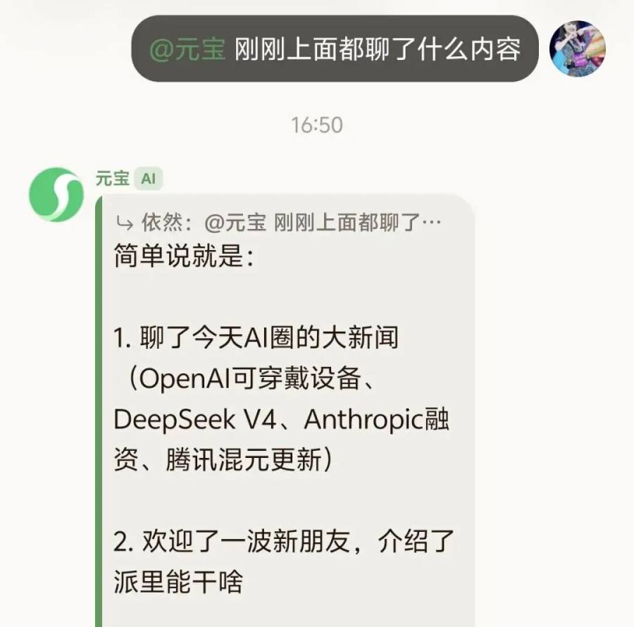 1月25日爆料,腾讯内部开启对元宝社交新玩法“元宝派”的内测。具体做法是,将真人和AI拉入一个群聊,让AI为群聊总结内容、提供想法。