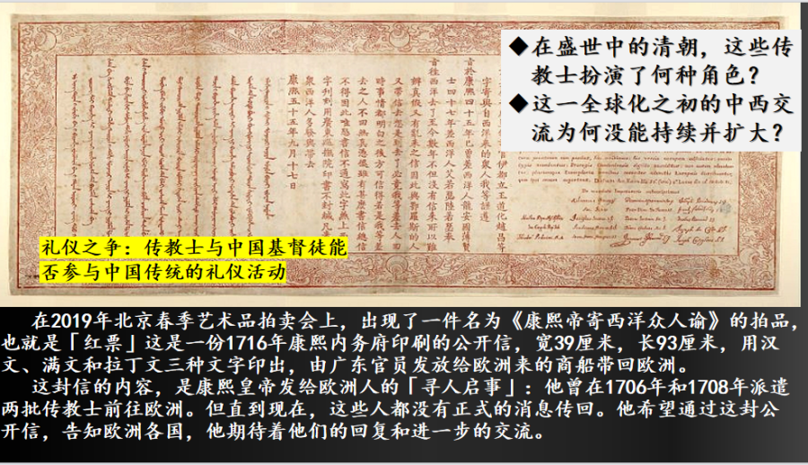 罗扬老师的教学设计基于课程标准中“认识清代前中期封建专制发展和世界形势变化对中国的影响,以及中国社会面临的危机,了解清朝统一全国经略边疆的举措,认识清代国家版图奠定的重要意义。”本课教学设计从全球史入手,尝试将清朝放置于世界早期全球化进程的整体思路,从君主视角下的盛世、中国视角下的盛世、全球视角下的危机三个角度多维呈现,旨在引领学生明晰本课时空定位的同时,深化学生对于清朝鼎盛与危机的理解,意在涵养学生的时空观念素养。从课堂线索结构建构方面,本课以康熙的红票作为导入,设计学术情景,激发学生学习兴趣的同时引出问题:“为何清朝前中期与西方的交流没能持续并扩大?”将这一问题作为贯穿全课的暗线,以清朝盛世在政治、边疆治理领域的发展为明线,两线交织汇聚于本课最后一个子目:盛世中所潜藏的危机。在这一过程引导学生理解生产力发展对清代盛世产生的推力及对生产关系的决定性作用,同时认识到上层建筑也会对经济基础构成反作用,涵养唯物史观素养。