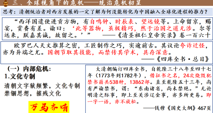 在课标提出的核心问题解决与处理方面,本课选取历史地图、清实录等多种史料类型,以设计问题链、表格梳理、开放性问题等多种方式对清代前中期封建专制发展、清代国家版图奠定的重要意义、中国社会面临的危机等核心问题针对性突破,磨炼学生的史料分析与解读能力,涵养历史解释与史料实证素养,在17、18世纪中西差距不断拉大的对比与分析中激发学生家国情感,厚植家国情怀素养。