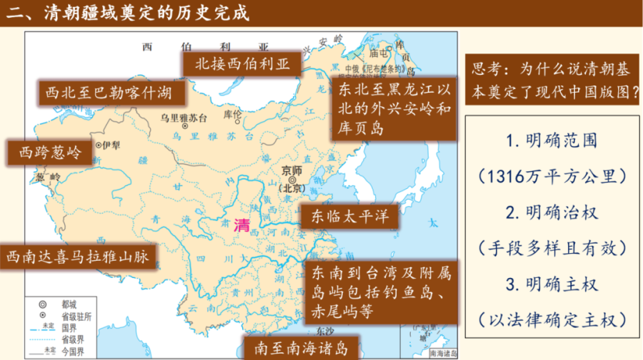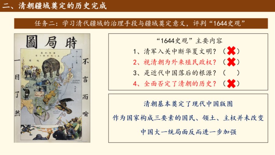 课前通过新闻素材引发学生对史观争议的思辨,奠定探究基础。课中依托奏折、档案、疆域图等多元史料,设计“君主专制强化”“疆域奠定”“中期危机”三大任务,引导学生从制度举措、疆域治理、社会问题等维度实证分析,在研读史料、解决问题中评判“1644史观”的四大观点。课堂收尾以习近平总书记关于民族团结进步的重要论述升华主题,串联知识脉络。教学中融合史料实证与价值引领,既让学生明晰清朝对现代中国版图的奠定意义,又通过辨析殖民政权特征、追溯文明延续性,破除错误史观,最终涵养学生维护国家领土主权、珍视民族团结的家国情怀,实现历史学科立德树人的核心目标。