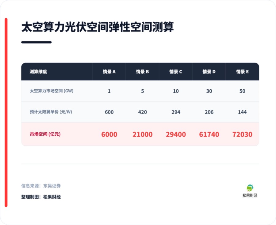 传统卫星用电,需求极其有限。通信、遥感卫星的太阳翼功率通常在几千瓦量级,全球一年发射一两百颗,全年太阳翼市场不过十亿级人民币。即便低轨卫星星座数量爆发,光伏也只是配套成本的一部分,很难撑起万亿想象。但太空算力把这个估算改写了。