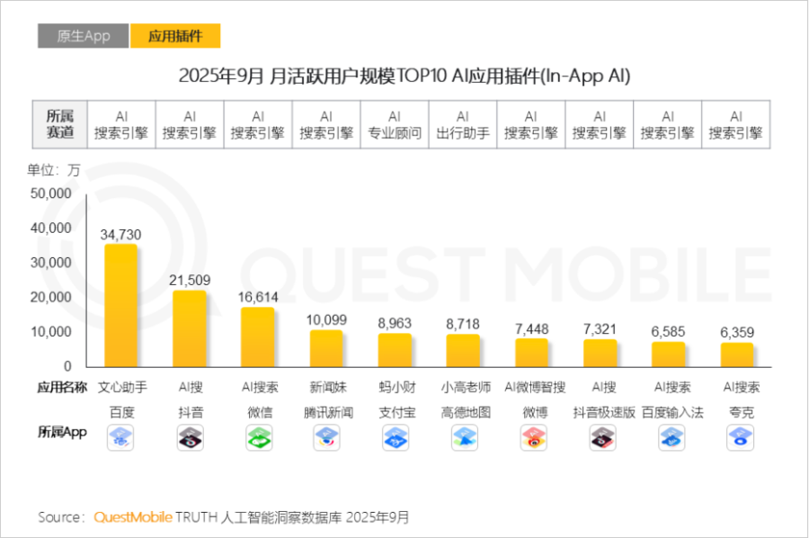 但若把文心助手看作百度的一个AI应用插件,它的竞争力就一下子上来了:文心助手的月活遥遥领先于抖音、微信、支付宝等App的内置应用插件。