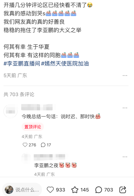 “开播几分钟评论区已经快看不清了,我真的感动到哭”,一众网友在社交媒体平台上表达了对李亚鹏当晚直播的触动之情,并将其誉为“李亚鹏之夜”。
