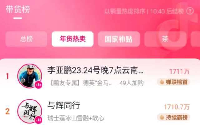 尽管“与辉同行” 凭借 16.5 小时的超长直播时长,单日销售额仍高于李亚鹏直播间,但后者以四分之一的时长实现如此成绩,已然创造了个人带货生涯的巅峰。