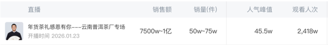 剁椒Spicy注意到,这场直播中“云南普洱茶厂”关联品牌方为“PE 1975茶叶旗舰店”,仅凭这场直播就斩获 5000 万 - 7500 万业绩。