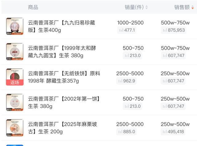 数据显示,当晚茶类产品贡献了近半数销售额,5 款陈年生茶销售额合计达 1750 万 - 3000 万,仅茶类产品总销售额就达到 2500 万 - 5000 万元。