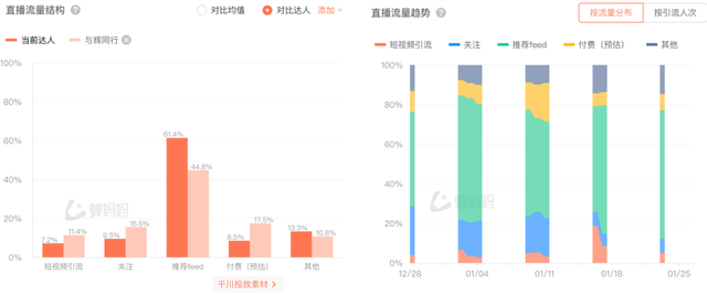 从付费投流比例来看,其直播间付费投流比仅为8.5%,约为“与辉同行”直播间的1/2,这意味着李亚鹏直播间这波热度,主要是靠相关话题热度带动,而并非商业投流操作下的结果。对比之下,李亚鹏直播间的流量结构中,最高的一项是平台推荐feed流带来的人气,比例高达61.4%,高于“与辉同行”(44.8%)。