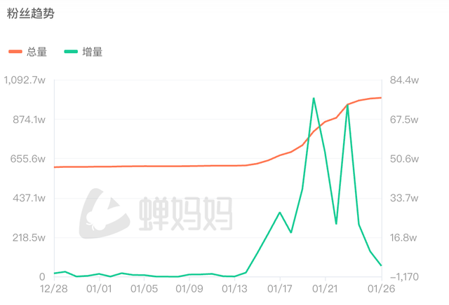 这背后是李亚鹏从 1 月 13 日开始的公益铺垫:他在抖音、视频号、小红书接连发布 4 条关于嫣然天使儿童医院的消息,其中《最后的面对》虽仅获 59.8 万点赞,却成功撬动公众对唇腭裂救助公益的关注。由于公益基金 “专款专用” 无法支付房租,直播带货成为公众支持公益的间接出口,10 天内其抖音账号涨粉 334万,截至1月28日粉丝量达到1000.8万。