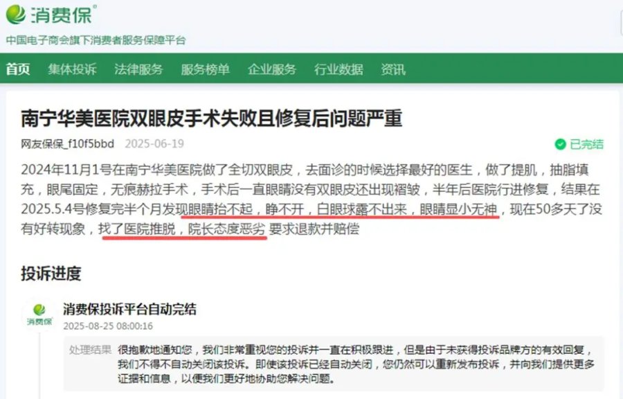 2024年11月1日,一位消费者在南宁华美医疗美容医院,做了全切双眼皮、提肌、抽脂填充、眼尾固定、无痕赫拉等多项高阶眼部整形项目。术后不仅未形成理想中的双眼皮,还出现严重褶皱与形态异常,让她无比痛心。