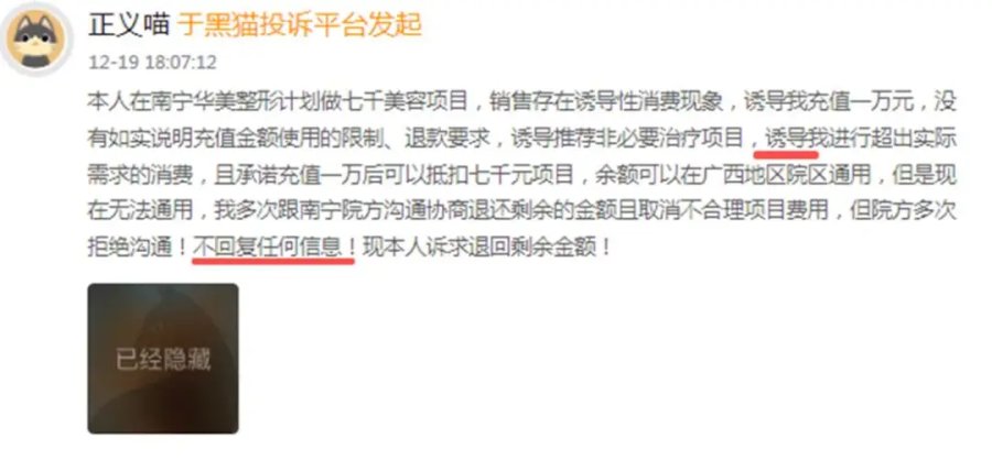 在黑猫投诉平台上,关于南宁华美医疗美容医院的投诉已有二十多条。