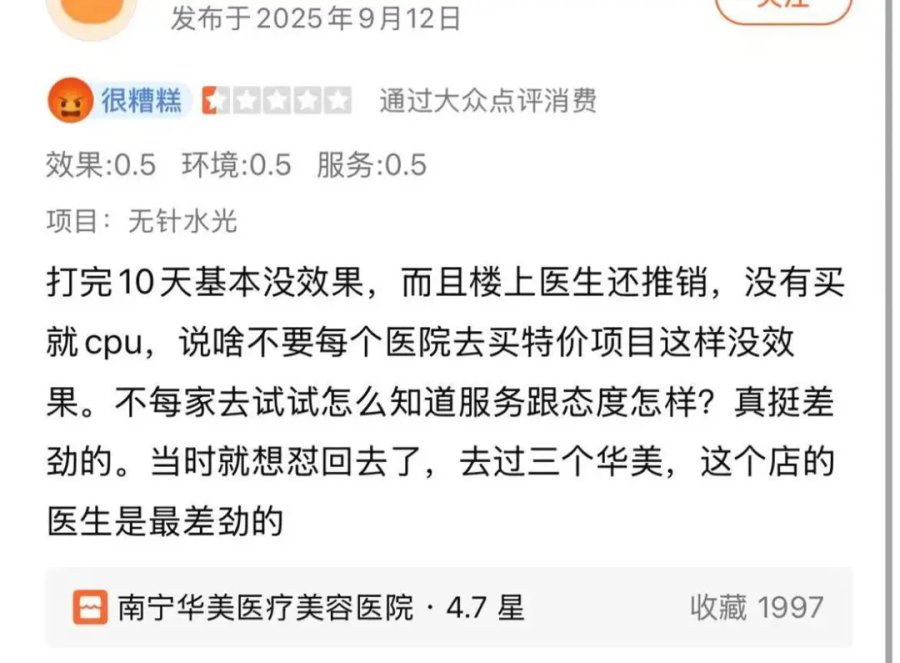 2025年9月,她在南宁华美医美做完项目后,10天基本零效果,而医生却继续推销,被拒后直接洗脑PUA,扬言别老去不同医院买特价项目,否则没效果,态度令人不适。