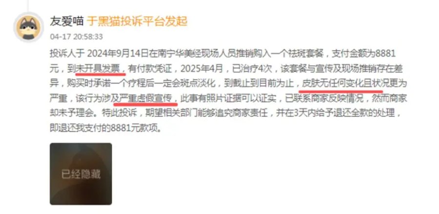 2024年9月14日,有消费者在南宁华美医美被现场推销购入8881元祛斑套餐,即便有留存支付凭证,但时至今日却没有开发票。而医院承诺的疗程结束斑点必然淡化,可截止2025年4月已完成了4次治疗,皮肤毫无改善反而加重。
