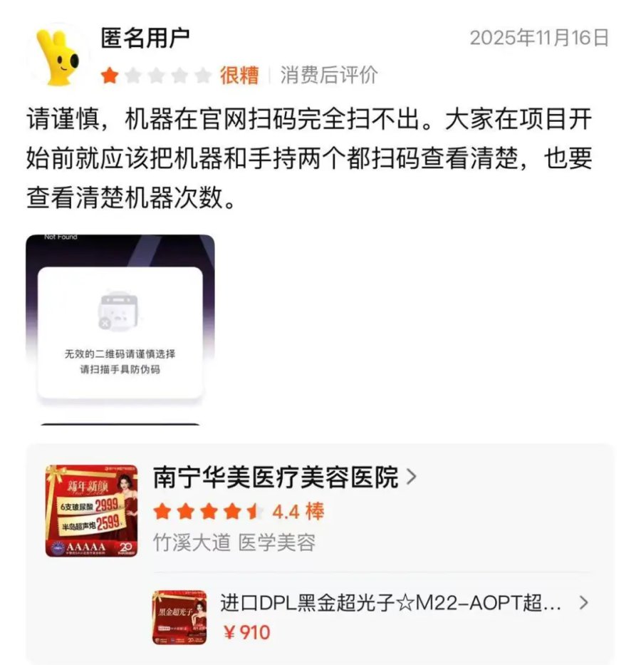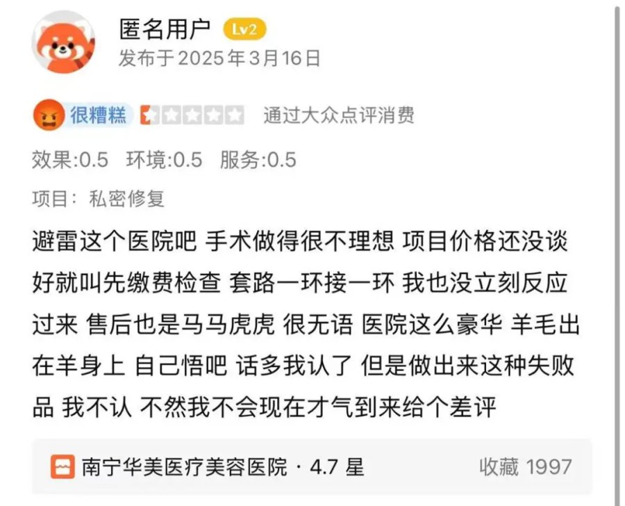 在大众点评等社交平台上,也有不少用户吐槽南宁华美医疗美容医院。