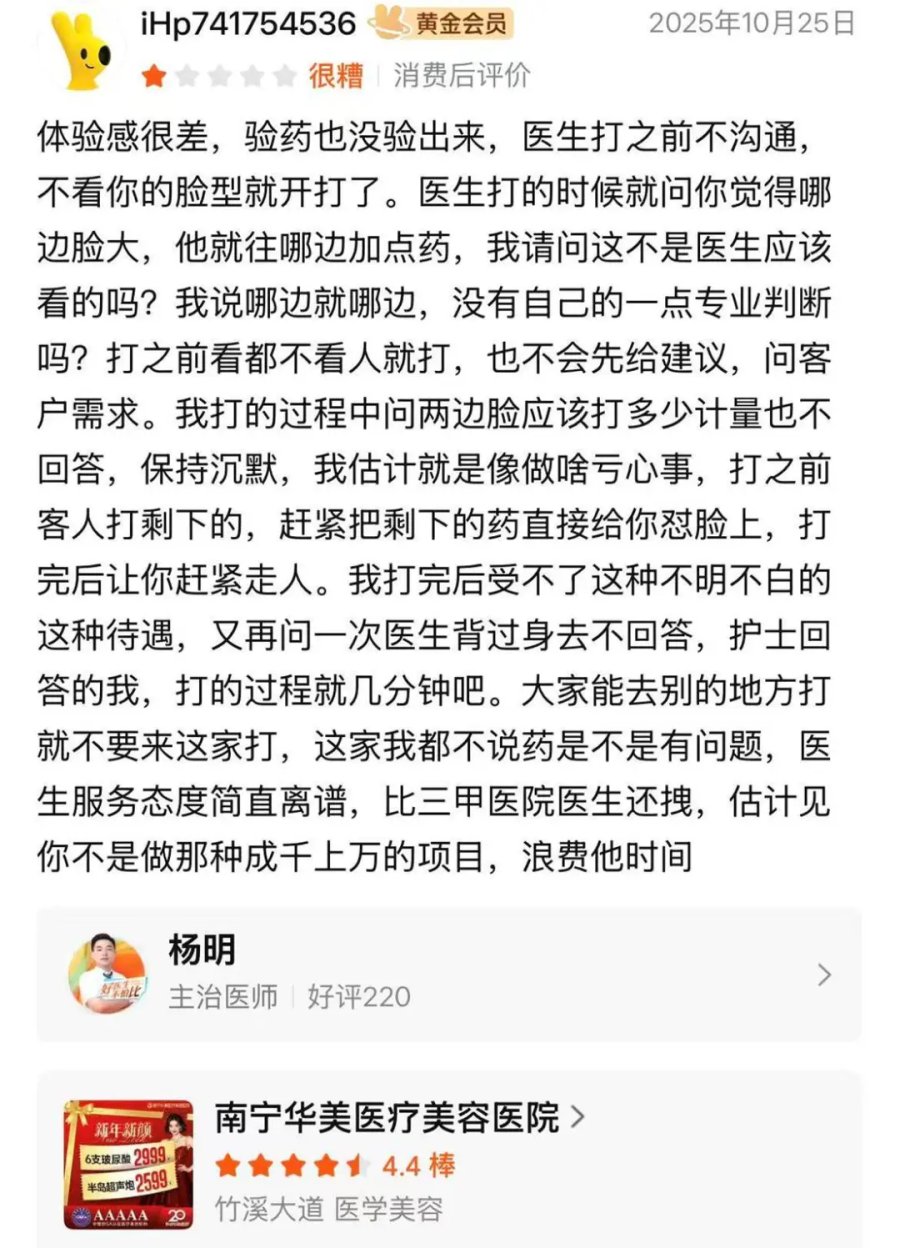 医生术前零沟通、零评估,连脸型都不看就准备上手,术中药品剂量多少、如何分配皆沉默以对,手术全程仅几分钟,严重怀疑是把其他客人剩余药量匆匆怼脸,打完即催人离开。