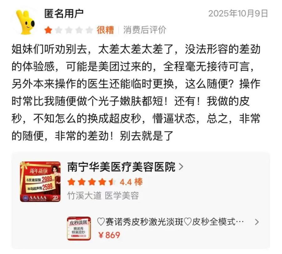 更有消费者血泪劝退,在美团下单后全程零接待,像被空投到操作间,原定医生临场被换,流程随意得堪比抽奖。