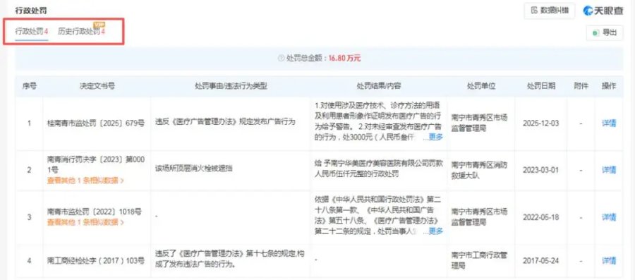 根据天眼查公开信息,截至2025年底,南宁华美医疗美容医院有限公司已被行政处罚8次。