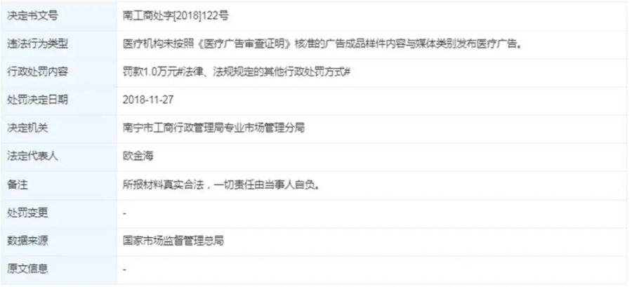 可南宁华美医美并没有从中吸取教训,在2018年11月,又因违规发布医疗广告,再次被处以10000元的罚款。这一次的处罚,本应让南宁华美医美更加谨慎,可它却依旧我行我素。