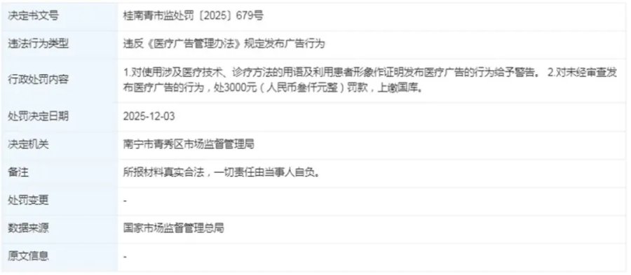 可悲的是,2025年南宁华美医美仍不知悔改。在12月3日,南宁华美医美再次因为违规发布医疗广告,被相关部门处罚3000元。