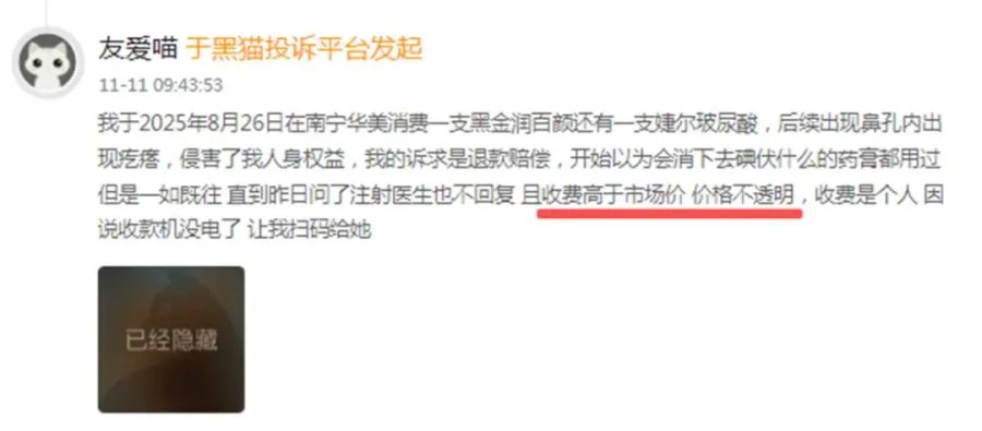 2025年8月26日,消费者在南宁华美医美注射1支黑金润百颜+1支婕尔玻尿酸,当天工作人员以收款机没电为由,让私人微信扫码收款,到家后消费者不放心,在网上查询才得知,南京华美医美的价格高于市面,并且无透明公示。