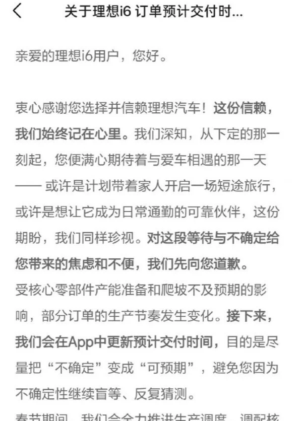 理想i6交付延迟4-6周,称因核心零部件产能爬坡不及预期,与宁德时代电池供应有关