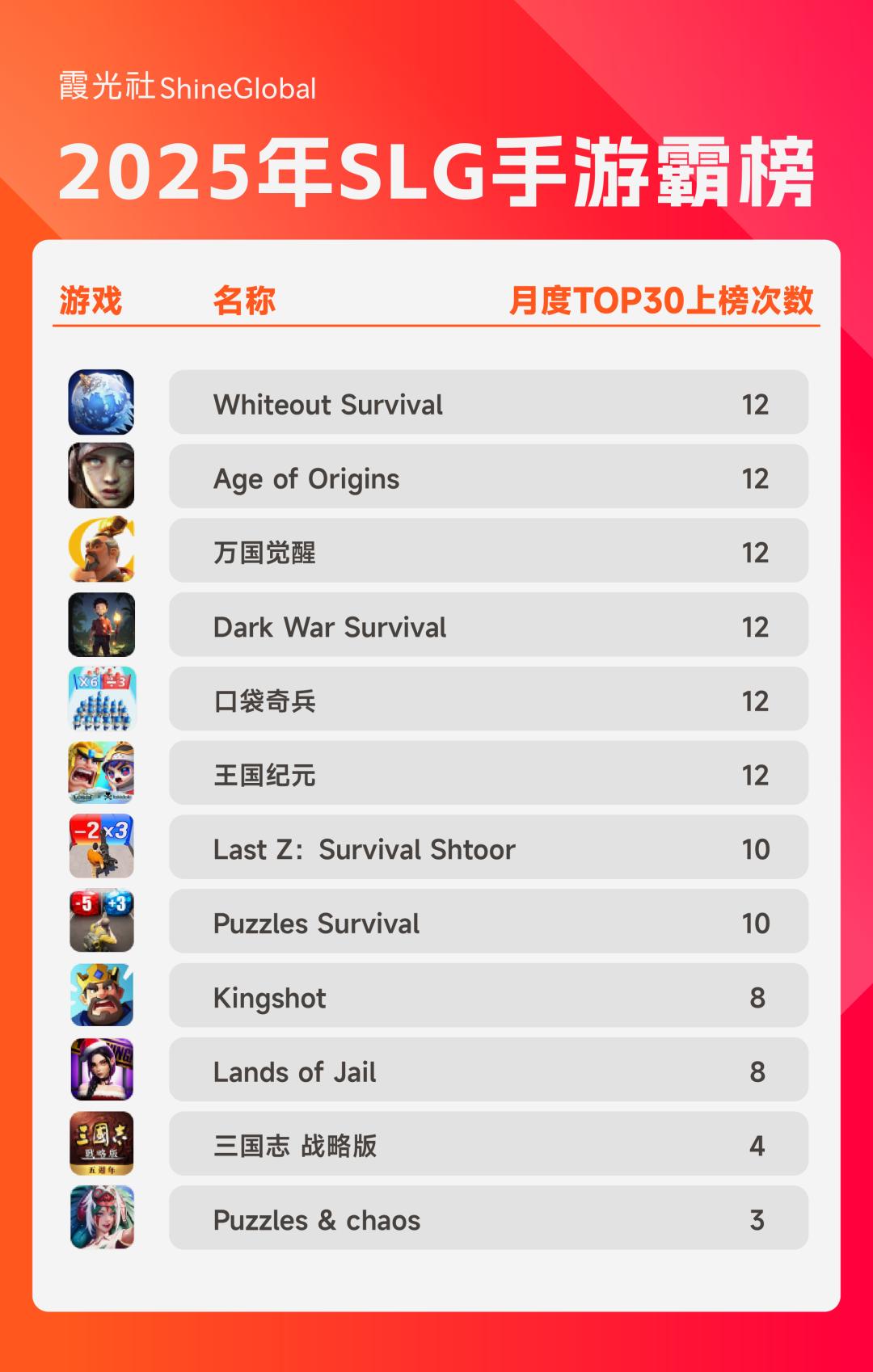 2025年月度国产手游海外收入Top 30中,SLG几乎一年时间里,都占据榜单的三分之一。