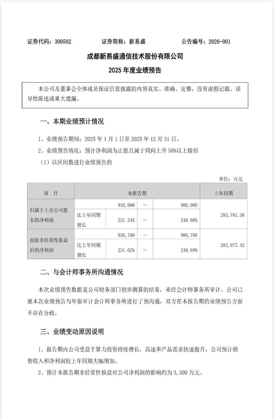 2026年1月30日晚间,新易盛(300502.SZ)发布2025年业绩预告:公司预计全年归母净利润94.0亿元-99.0亿元,同比激增231.24%-248.86%,扣非净利润与净利润基本持平,仅3300万元非经常性损益影响业绩,这意味着此次业绩爆发几乎完全由主营业务驱动,盈利质量与含金量拉满。