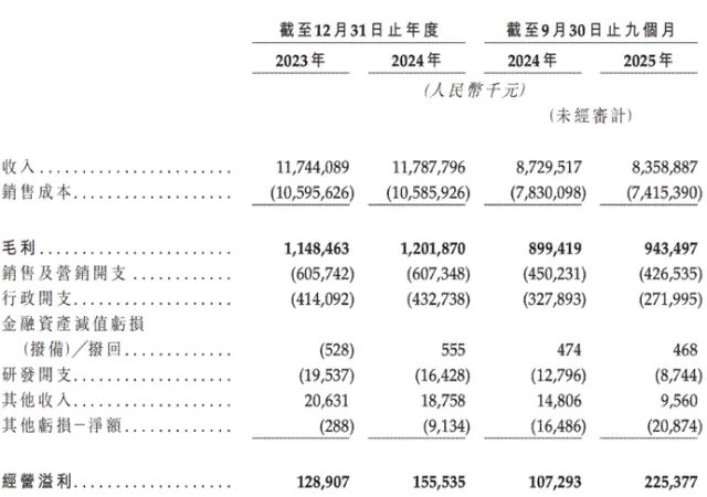 营收增长出现停滞是第一个信号。根据招股书数据,2023年钱大妈营收117.44亿元,2024年营收增加到117.88亿元,同比增长0.4%,2025年前三季度营收为83.59亿元,比去年同期的87.3亿元下降了4.2%。