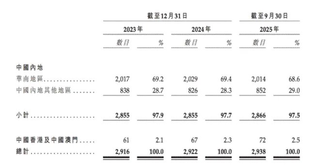 尽管号称全国连锁,但其业务高度集中在华南地区。截至2025年9月30日,钱大妈2938家门店中,2014家集中在华南市场,占比68.6%,贡献了65.9%的收入。
