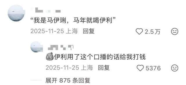 有趣的是,整场传播也涉及了伊利的老对手,蒙牛。此前在最开始有了这个梗时,便有网友建议蒙牛抢先一步签下马伊琍,打造“伊琍都说蒙牛好”的广告,而在伊利官宣之后,也有人建议蒙牛转而合作“马丽”,主打一个“伊”不发音。但今年,蒙牛却并没有参与这场明星谐音梗大战,而是通过一只洗脑风很强的“马上牛”AI广告,另辟蹊径玩起了谐音梗。而在艺人方面,蒙牛邀请了李诞、王小利、罗家英三位光头艺人”,通过“带彩头,马上牛”的slogan进一步强调“马上牛”,强化品牌痕迹。