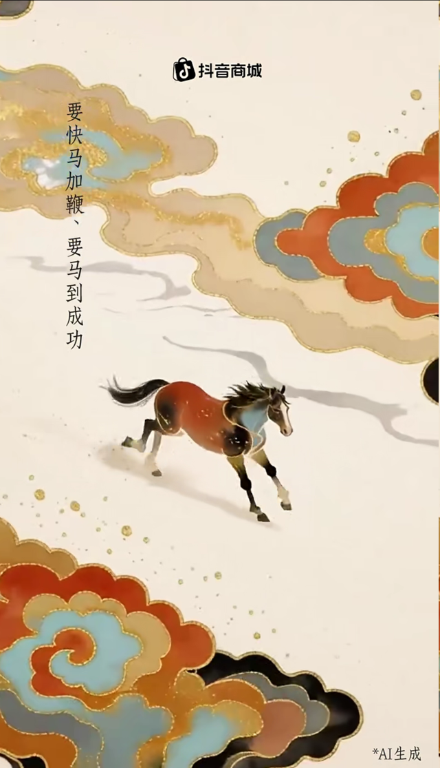与此同时,AIGC也广泛应用于马年CNY广告中,彻底包围了用户:从蒙牛“马上牛”广告里跳脱的牛马,到抖音商城“放自己一马”中流转着非遗瑰丽的水墨骏马,AI技术批量化介入春节档。它以传统特效五分之一不到的成本,实现了更多放飞的脑洞。