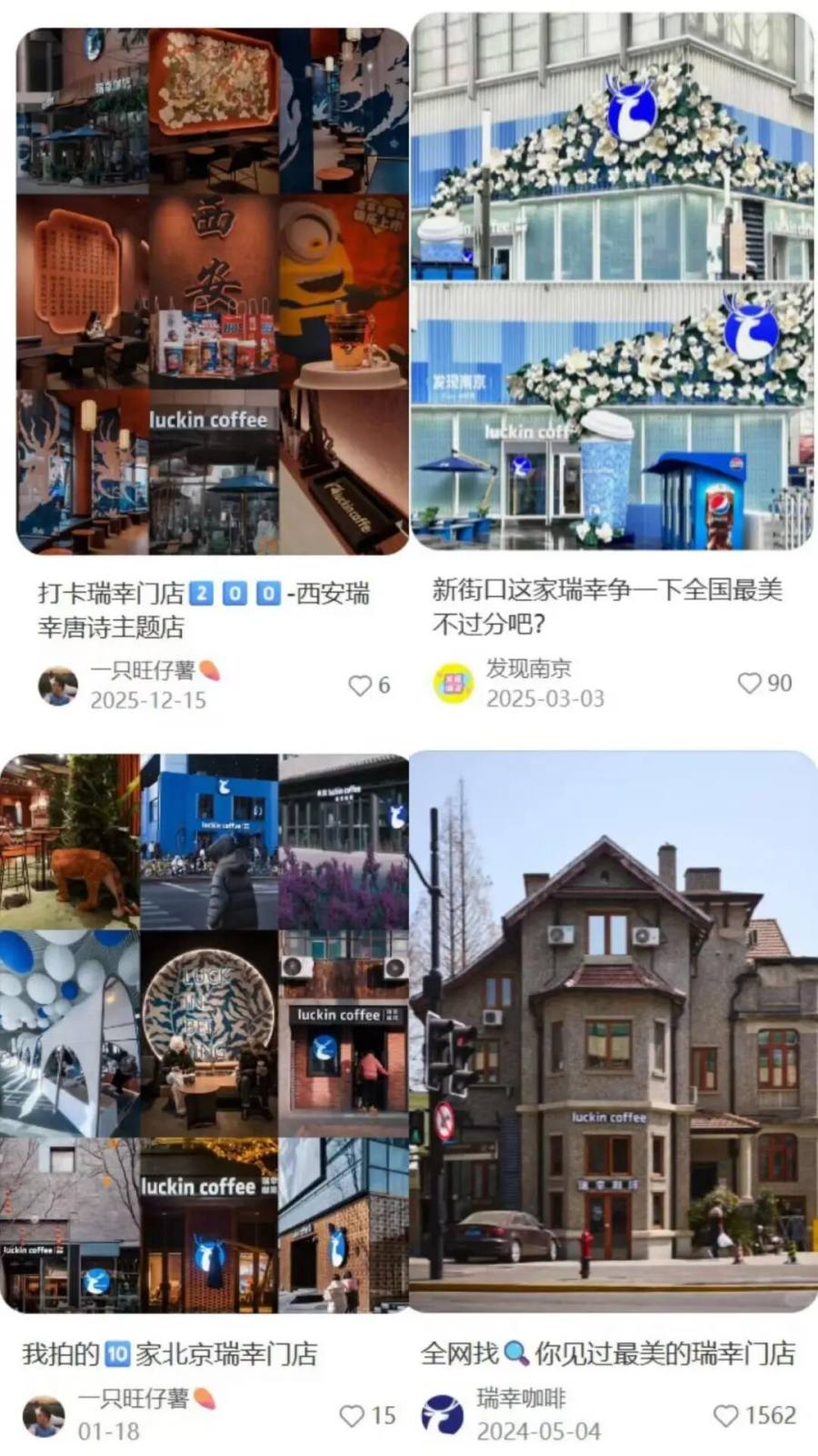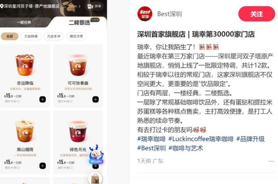 这并非瑞幸的第一个精装大型门店。在因“接管星巴克”走红之前,瑞幸在不少地区都打造过巨大的门店造景:以吊脚楼和山水为设计背景的重庆主题店、以唐诗为设计概念的西安唐诗主题店、设有巨大金属科技感模型的北京中关村20000店……瑞幸官方账号也频频发布#寻找最美瑞幸门店#的互动话题。