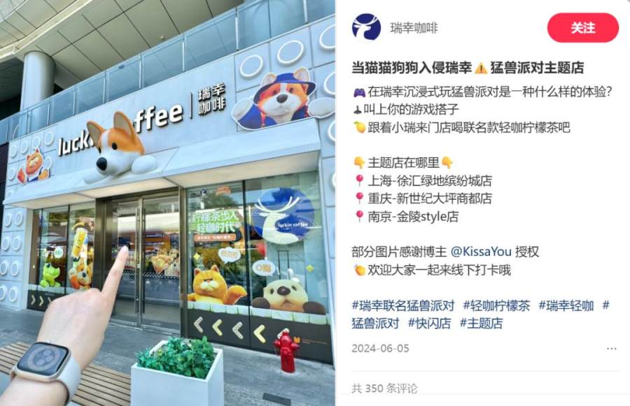 除了结合主题元素的硬装,瑞幸部分门店的店内陈设也会跟随联动热点变化:瑞幸上海南京东路店在与多邻国联动期间布置了大量“绿鸟”地毯、LED屏和装饰画;与《鬼灭之刃》联动期间,瑞幸广州欢聚大厦店利用楼层高度差和镜面效应还原了电影中的决战场所无限城;与游戏《猛兽派对》的联动主题店更是在上海、重庆、南京三地同时落地,另有17家门店贴上了玻璃窗贴。
