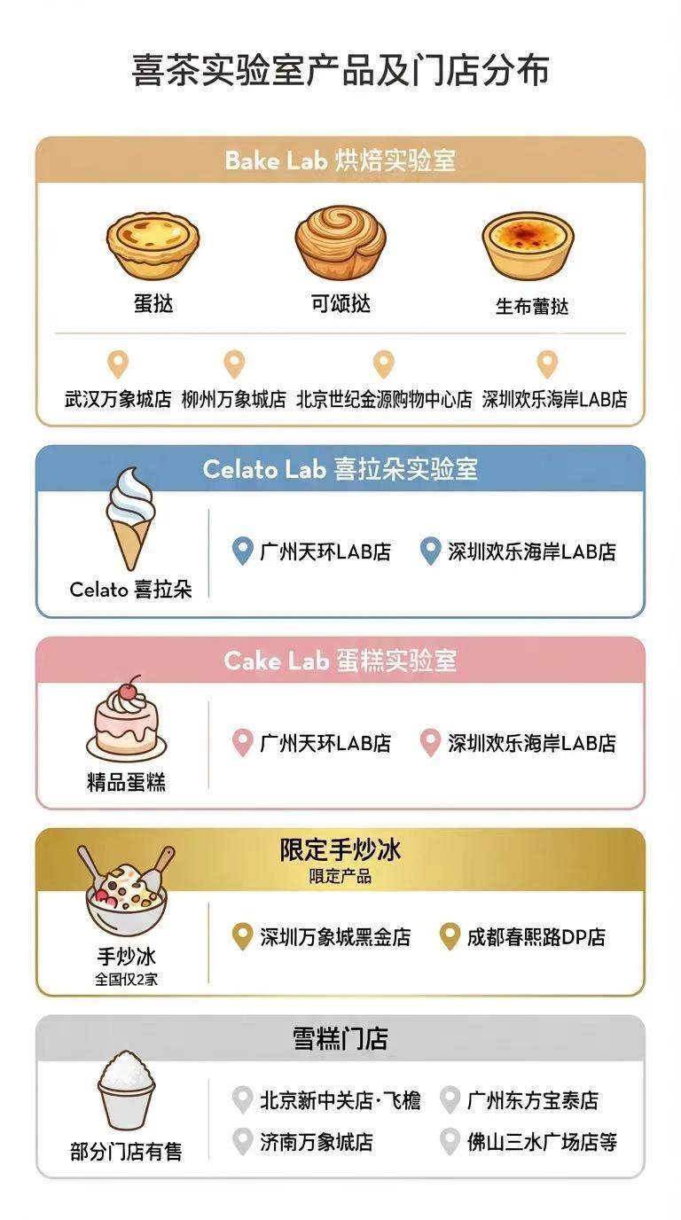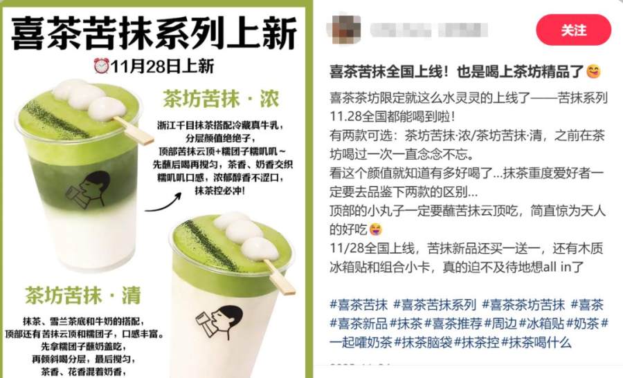 而门店限定也是试水新业态,测试新品效果和客单价边界的方式。除了喜茶正在实验室门店尝试的烘焙、特调和喜拉朵(gelato),25年年底在全国上线的喜茶苦抹系列和近日上新的苦巧都曾是茶坊店的限定产品。先试点、再铺开的模式压低了打造原创新口味的市场风险,保护了团队的创新动力。