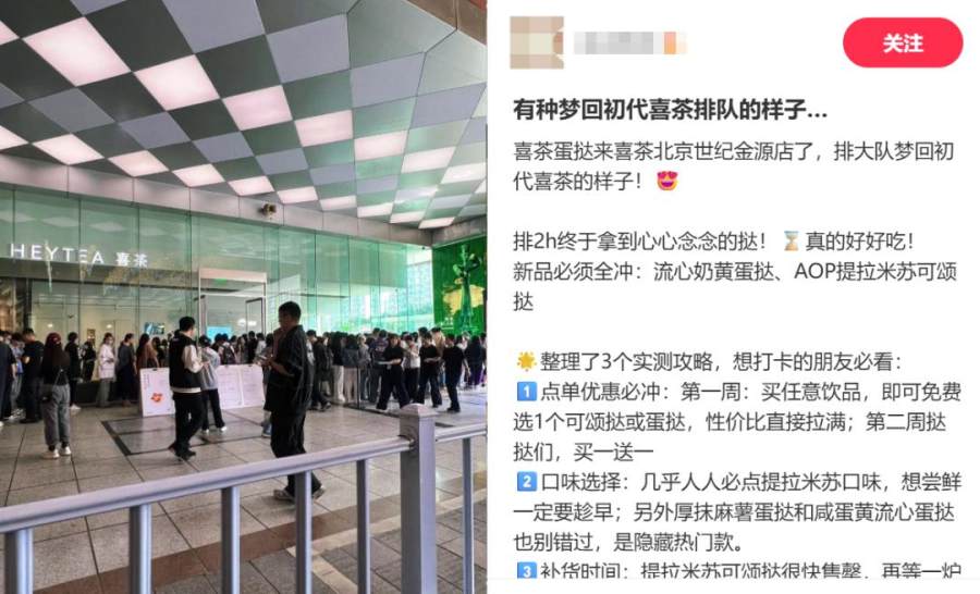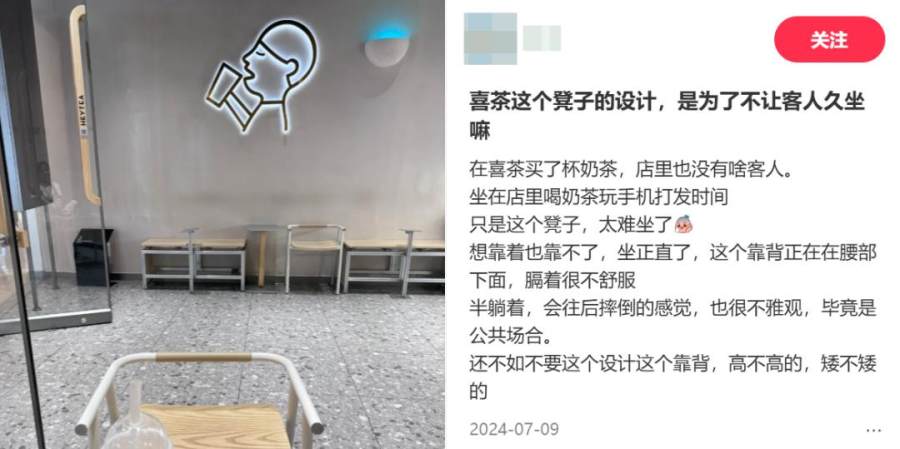 过去,社媒上曾有不少关于喜茶门店客座区椅子不舒服,无法久坐的帖子。对加盟店而言,停留率不是重要指标,但对于品牌本身来说,“停留”不仅能转化为品牌认知,还可能增加衍生新购买的机会。“买一送一到店自取”可以引来人,而重装直营门店,设计展览装置和舒适化座椅是为了留住人。