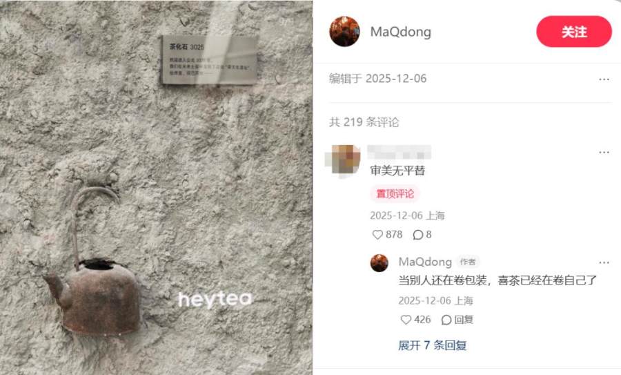 1月底,喜茶在微博发布了过去一年的“小事记”。“小事记”显示,2025年,喜茶在茶饮空间方面做了诸多探索,如将130多家门店重新装修为“灵感茶室”,包括前文提到的静安大悦城“3025年茶化石”主题茶室。
