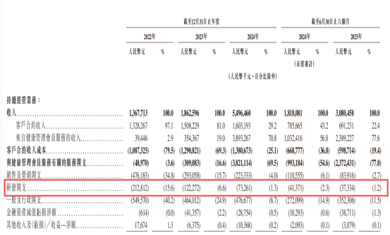 但从业绩上看,虽然微医控股营收攀升,但仍受到连年亏损,业务高度依赖单一客户,毛利率走低至0.7%,贴上AI标签但研发投入不足等问题的困扰。