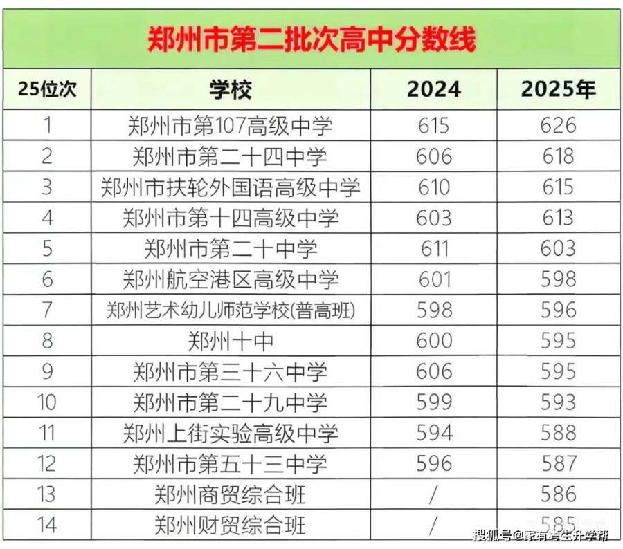 郑州市第107高级中学以626分高居榜首,成为二批次中唯一站上620+的学校。下面的梯队分明:二十四中、扶轮外国语、十四高构成第二档;二十中、港区高中、幼儿师范普高班等六所组成第三档;上街实验、五十三中和两个新兴的“综合班”垫底。