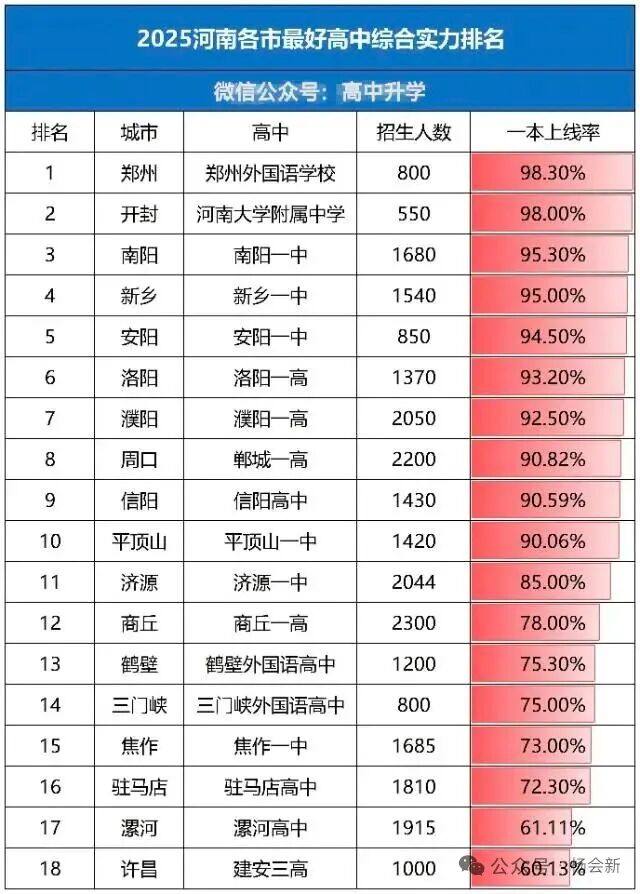 河南各市“最好高中”排行榜又在家长群刷屏了。郑州外国语学校以98.30%的一本率蝉联榜首,但这份榜单藏着比排名更复杂的故事——有些学校的一本率靠的是“制度特权”,有些靠的是“极限压榨”,还有些数据本身就值得怀疑。