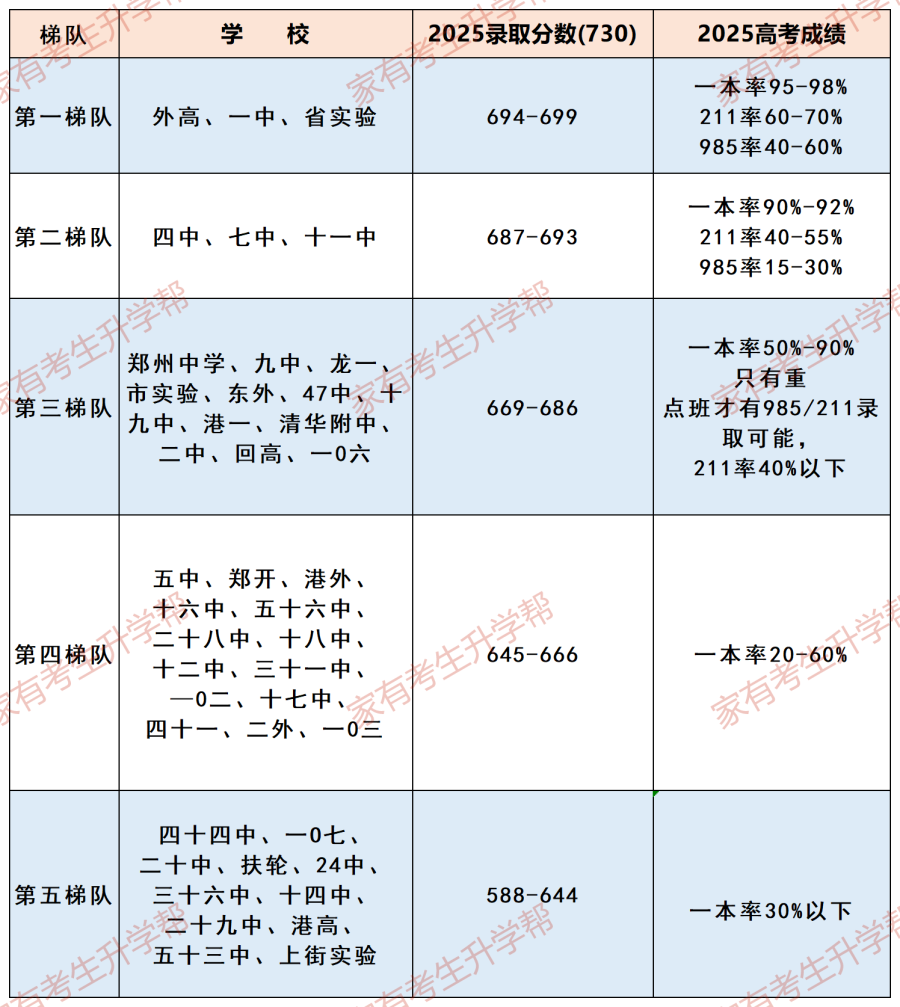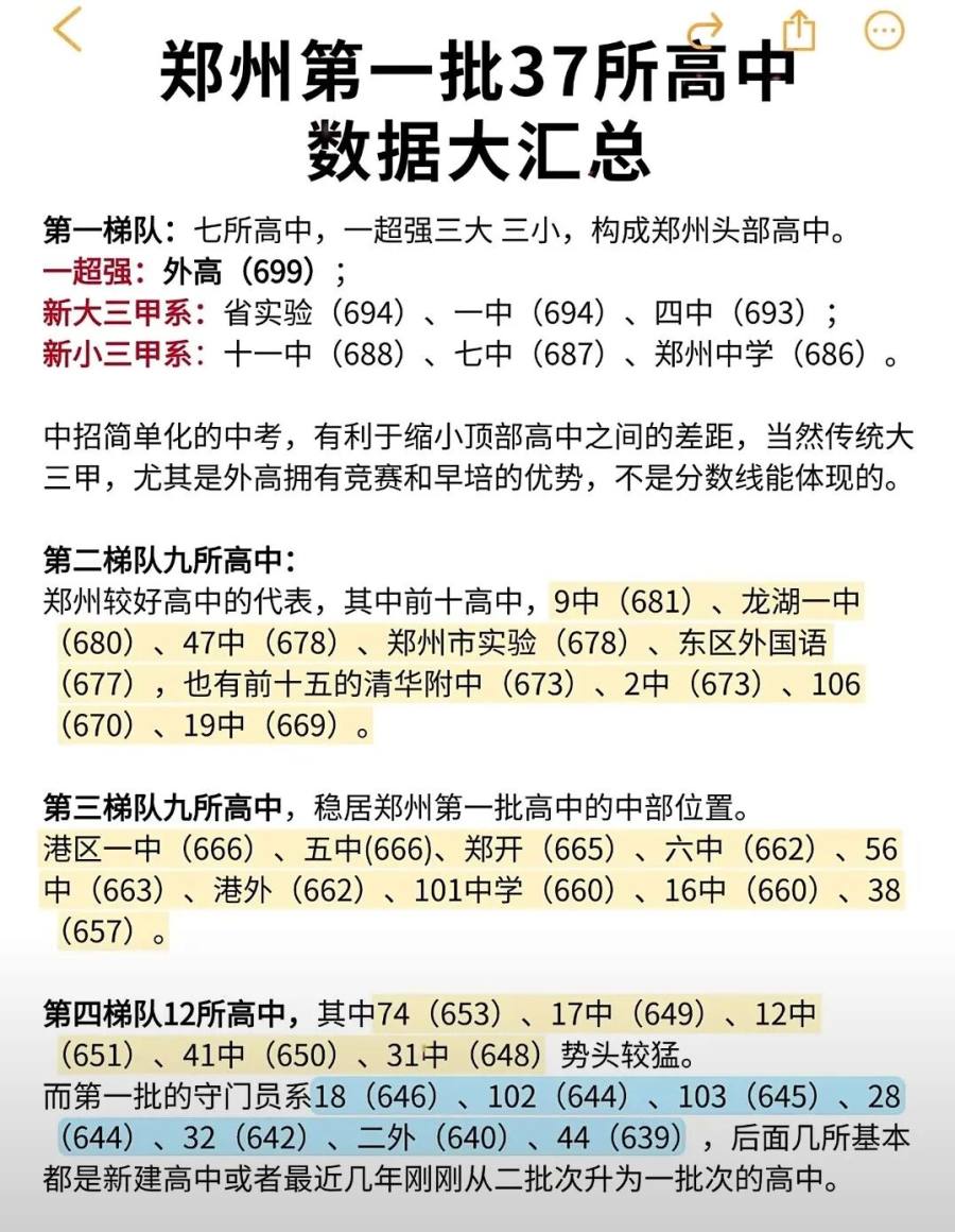 这些数字不是股票代码,也不是彩票号码,而是2025年郑州中招的录取分数线。这张被标注为“郑州第一批37所高中数据大汇总”的表格,最近在郑州家长群里疯狂转发。它把郑州的顶尖高中分成了四个梯队,从“一超强三大三小”到“守门员系”,像一张精心绘制的地形图,标明了这座城市教育战场的每一处高地与洼地。