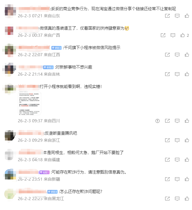 另一部分网友则将此事与行业竞争关联,直言这是“朴实无华的商战”,认为类似淘宝链接在微信分享时常遇限制等情况,暗示此次事件或为大厂间竞争的表现,甚至有网友呼吁反垄断相关调查介入。